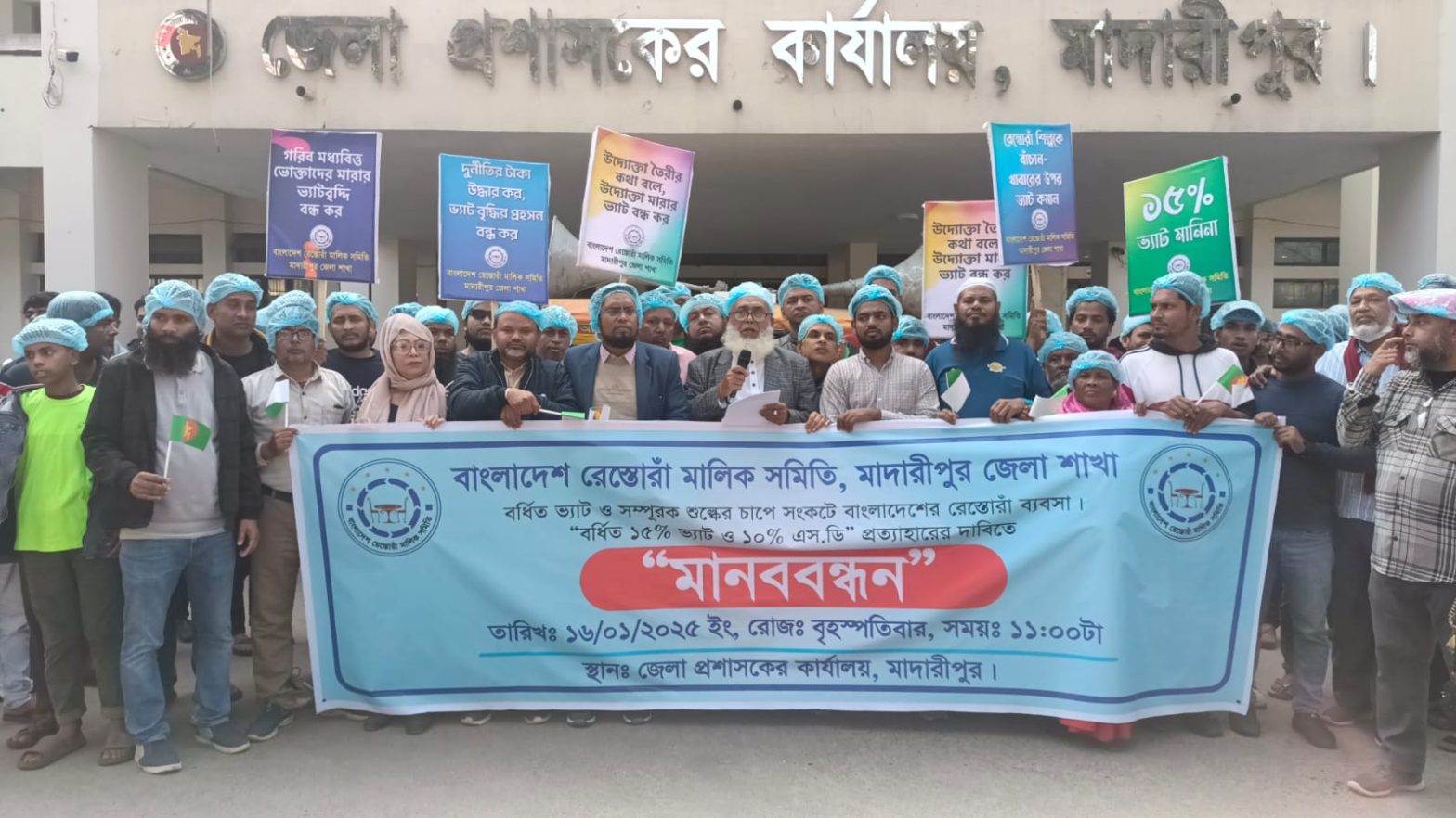 বাংলাদেশ রেস্তোরাঁ মালিক সমিতির উপর বর্ধিত ১৫ ভাগ ভ্যাট ও ১৩ ভাগ সম্পূরক শুল্ক প্রত্যাহারের দাবিতে মাদারীপুরে মানববন্ধন কর্মসুচি পালিত হয়েছে। বৃহস্পতিবার (১৬ জানুয়ারী) বেলা ১১ ঘটিকায় জেলা প্রশাসকের কার্যালয়ের সামনে ঘন্টাব্যাপী মানববন্ধন কর্মসূচি পালন করে বাংলাদেশ রেস্তোরাঁ মালিক সমিতি মাদারীপুর জেলা শাখা।