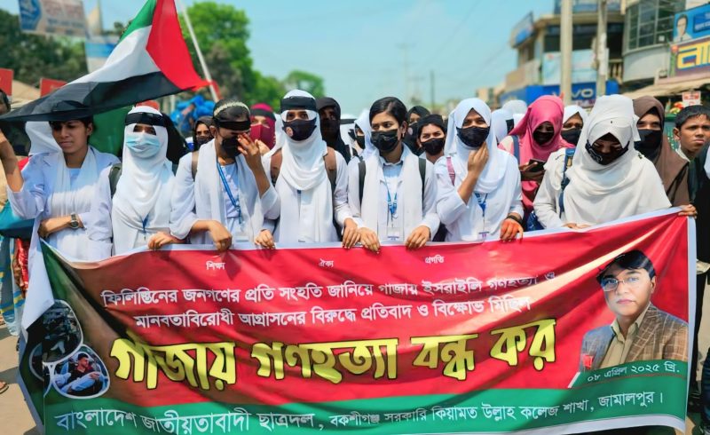 ৮ এপ্রিল মঙ্গলবার জামালপুর জেলার বকশীগঞ্জ সরকারী কিয়ামত উল্লাহ কলেজ ছাত্রদলের আয়োজনে কলেজ থেকে দুপুরে ফিলিস্তিনের গাজায় ইসরায়েলি বাহিনীর গণহত্যার প্রতিবাদে