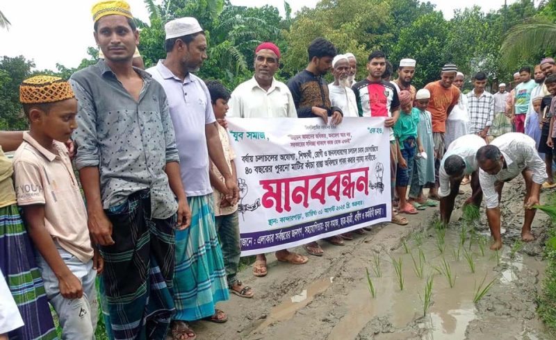 ২ আগষ্ট ২০২৫ খ্রিস্টাব্দ রোজ শনিবার জামালপুর জেলার সরিষাবাড়ী উপজেলায় জনবহুল একটি রাস্তায় ধানের চারা লাগিয়ে অভিনব কৌশলে প্রতিবাদ জানিয়েছেন এলাকাবাসী।