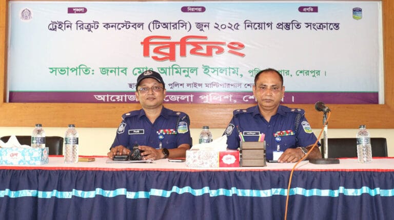 ১৭ আগষ্ট ২০২৫ খ্রিস্টাব্দ রোজ রবিবার শেরপুর জেলার নিয়োগযোগ্য প্রকৃত শূণ্য পদ অনুসারে ট্রেইনি রিক্রুট কনস্টেবল (টিআরসি) পদে নিয়োগ অবাধ সুষ্ঠু ও নিরপেক্ষভাবে সম্পূর্ণ করার লক্ষ্যে ব্রিফিং প্যারেড অনুষ্ঠিত হয়েছে। ১৬ আগস্ট শনিবার দুপুরে জেলা পুলিশের উদ্যোগে পুলিশ লাইন্স মাল্টিপারপাস শেডে আয়োজিত ব্রিফিং প্যারেডে নিয়োগ সংক্রান্ত ব্রিফিং প্রদান করেন শেরপুর জেলার টিআরসি নিয়োগ বোর্ডের সভাপতি পুলিশ সুপার মো. আমিনুল ইসলাম।